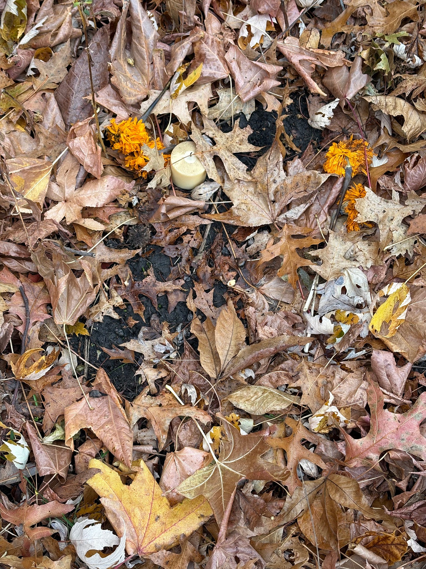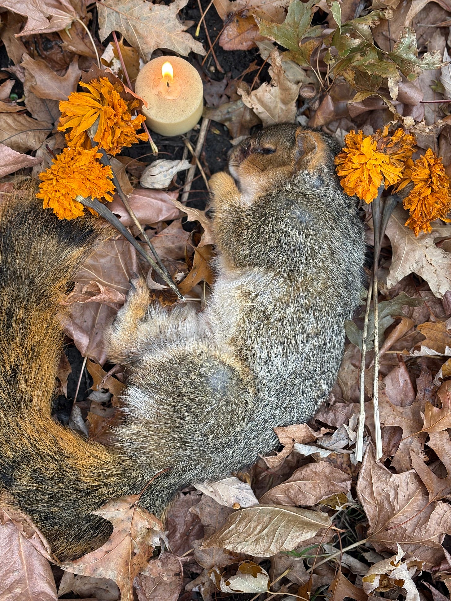 I sit next to him in a pile of leaves and gaze up at the tree where he may have lived. Several squirrel nests punctuate the half-bare branches. I google “do squirrels mourn” though I don’t know why, because there is part of me that trusts that every being does. Scientists confirmed it though. Sometimes squirrels will vigorously groom their dead, almost like they are trying to revive them. We are not supposed to anthropomorphize our more-than-human friends, but I can’t help but read that as magical thinking. I decide to leave him alone in case any of his squirrel family wants to tend to him. I tell him, I’ll come back soon.