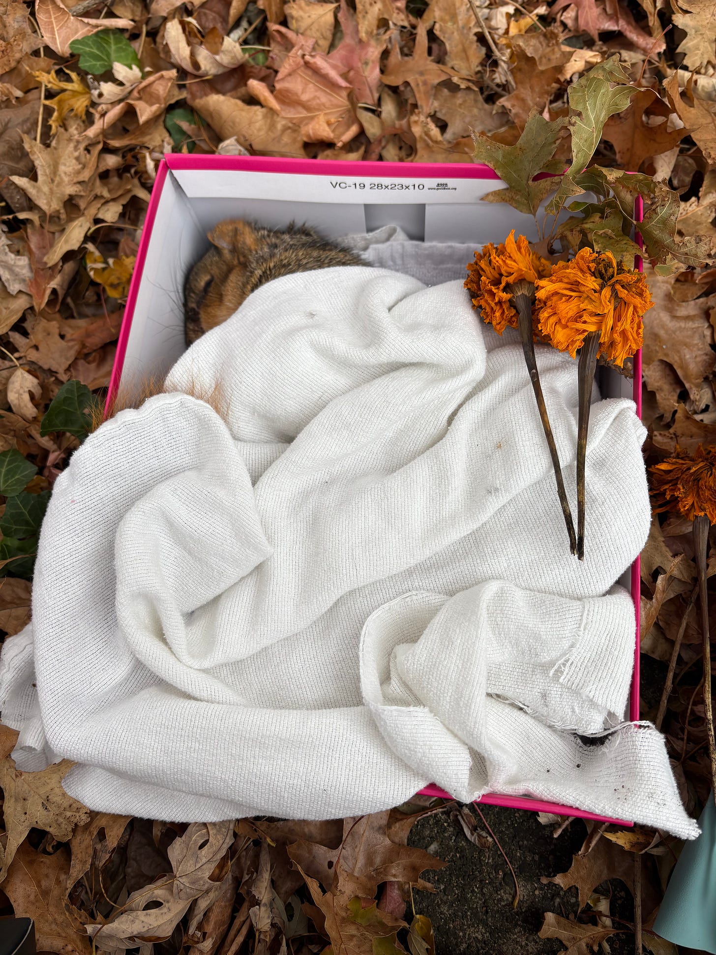 I get a shoebox, and cut a piece of the hospital blanket we kept from cancer summer, and grab some flowers from my porch, too. When I am near him, I swear we make eye contact. My chest hurts the way it does when people say their heart breaks. I put on gloves and carefully wrap him in the blanket, then gently curl him into the box. His breath now is very slow.